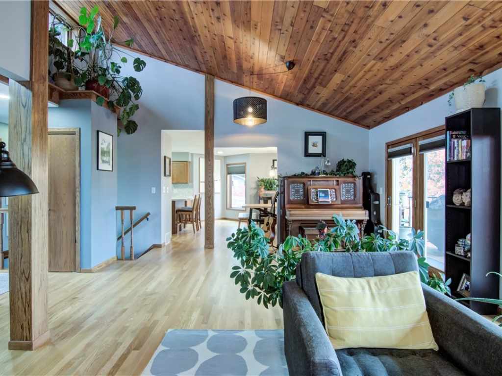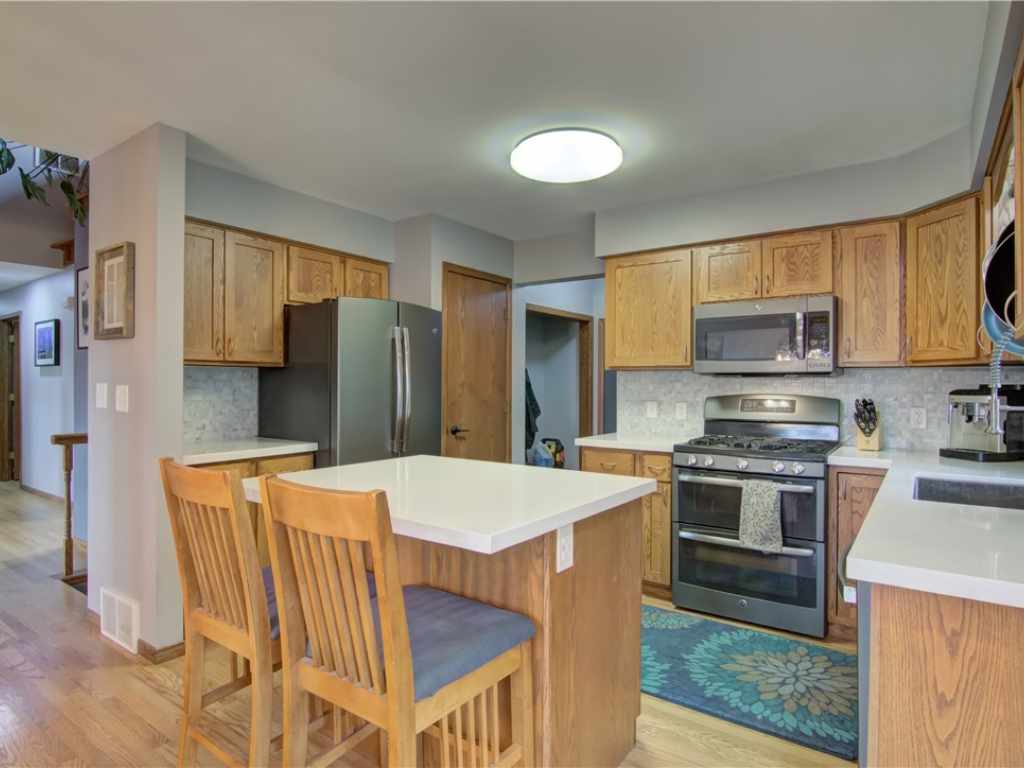 Beautifully renovated 5 bedroom / 3 bathroom ranch home located in SE Menomonie! Special features include hardwood floors throughout the KT/DR/LR/Front Entry, beautiful quartz counters in the kitchen, nice cathedral ceiling in the living room w/natural cedar finish, abundant natural light with all of the south facing windows, and enjoy the outdoors and stunning sunsets from the upper deck and covered patio below - both with weatherproof decking. The walk-out lower level adds a spacious family room w/cozy gas fireplace, two legal bedrooms, laundry, and a 3/4 bath. Very convenient location near to grocery shopping, farmers market, churches, schools and more! New roof 2022 and New AC 2025. Ready to move into! Sellers prefer a 60 day closing. Must see!