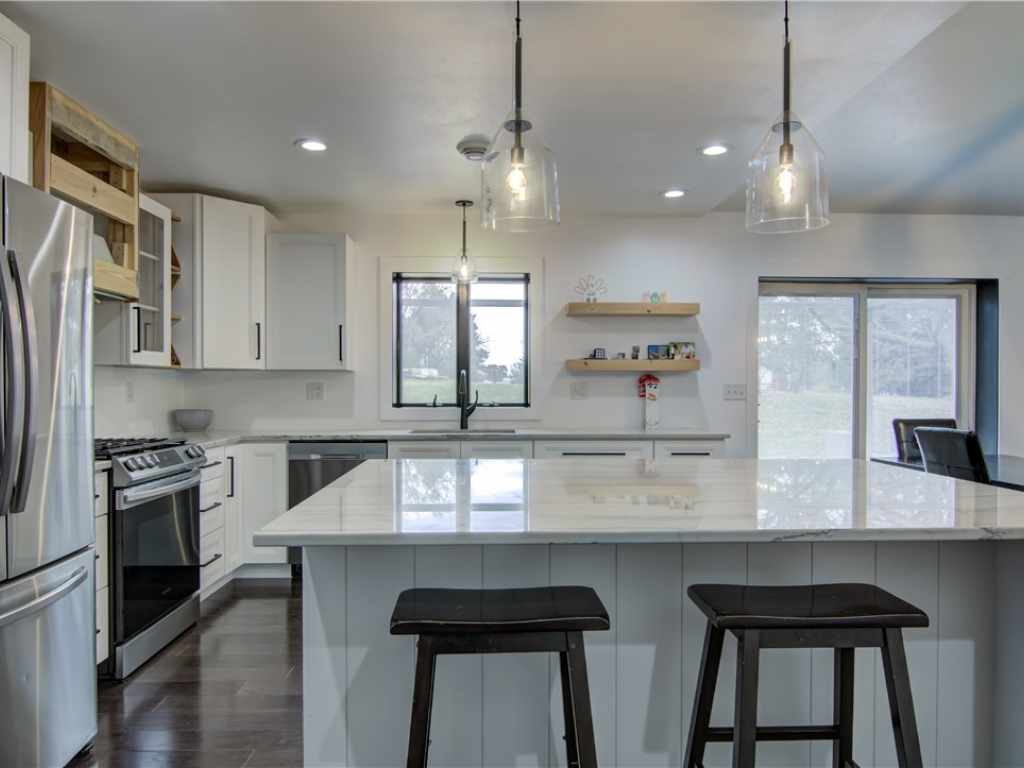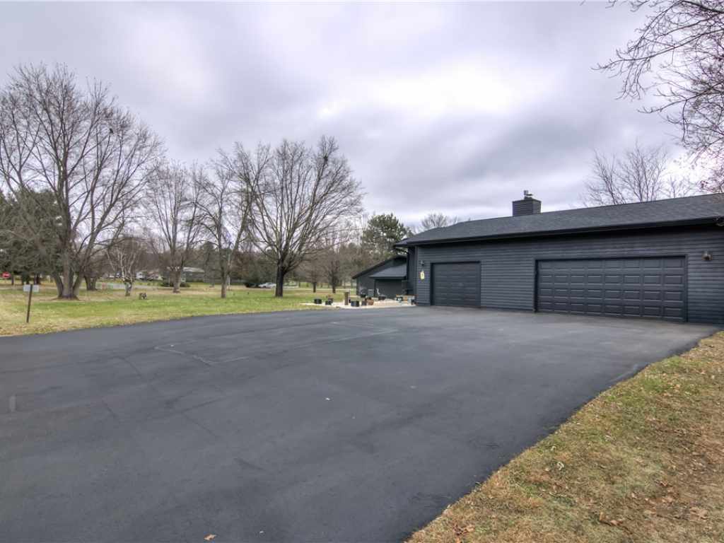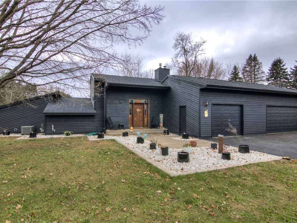 3BR/2 Full Bath UNIQUE BIRCH CREEK SOUTH MENOMONIE HOME! You will love the open KT/DR/LR w/the soaring vaulted ceiling and trendy electric fireplace, beautifully remodeled kitchen w/maple cabinets, quartz counters and soft close drawers, large master suite with double closet, full bath and separate vanity, and 3 car attached garage WITH one stall heated and insulated for a shop space if desired. Huge concrete patio area in rear for entertaining! 12" thick walls for efficiency! Many great updates include AC 2024, Furnace & water heater 2021, exterior just painted, shingles replaced with a 50 yr warranty and a wonderful 36' pergola added. This property includes a spacious 1.18 acre corner lot located outside the city limits for lower taxes and yet conveniently located near to River Heights Elementary, Menomonie High School, a close distance to UW-Stout and not far from the beautiful Red Cedar Trail!