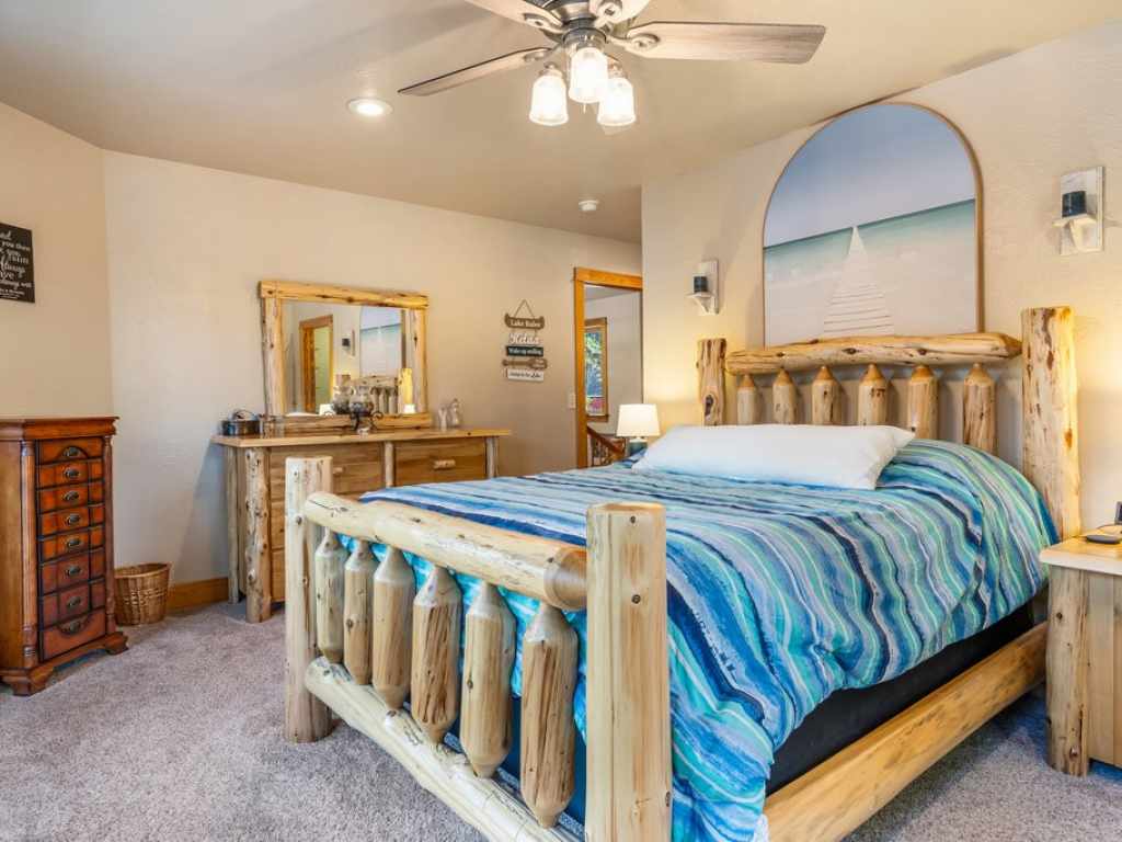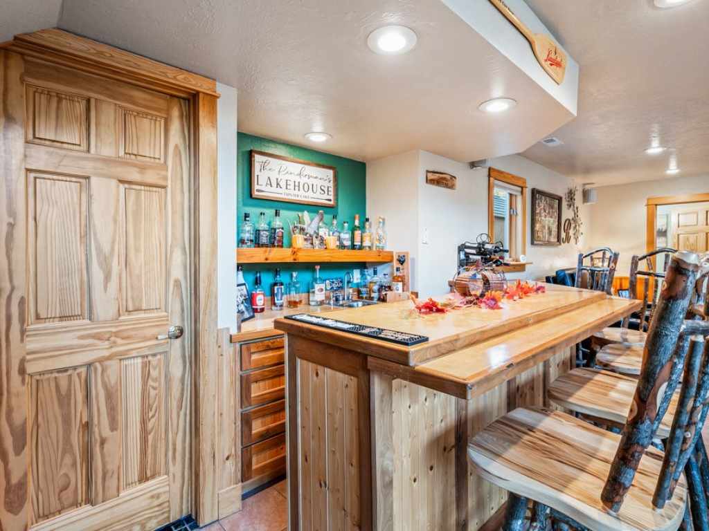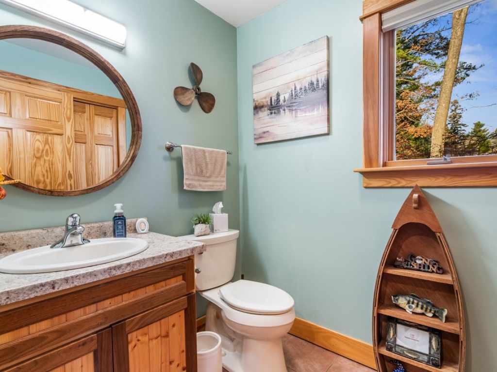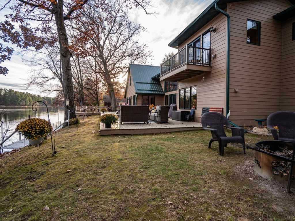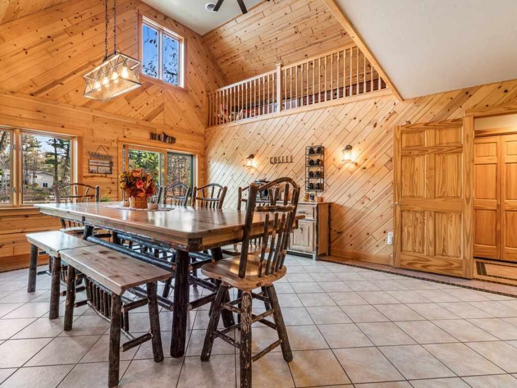 Welcome to lakeside living on Tainter Lake. This waterfront property offers an open and functional main floor layout designed for gathering, entertaining and everyday use. The main level features a large living room, rec/game room, wet bar, dining area, and kitchen, all connected by an open flow floorplan that extends to a newly built expansive deck overlooking the lake. Interior features include knotty pine vaulted ceilings, ceramic tile flooring, skylights, and natural light throughout. A wood-burning fireplace is capable of heating the home, and the main level also offers in-floor heat and a backup electric forced-air furnace. The upper-level owner’s suite includes a private balcony with lake views. The loft area may be converted into a third bedroom if desired. Outdoor lakeside amenities include a sitting area near the shoreline and a new aluminum dock. Great fishing right off the dock! Recent updates include interior and exterior paint, new deck and balcony, lighting, retextured drywall, quartz kitchen countertops, stainless steel appliances, new carpet, landscaping, and a storage shed. Walking distance to Jake's Supper Club and Pioneer Saloon.