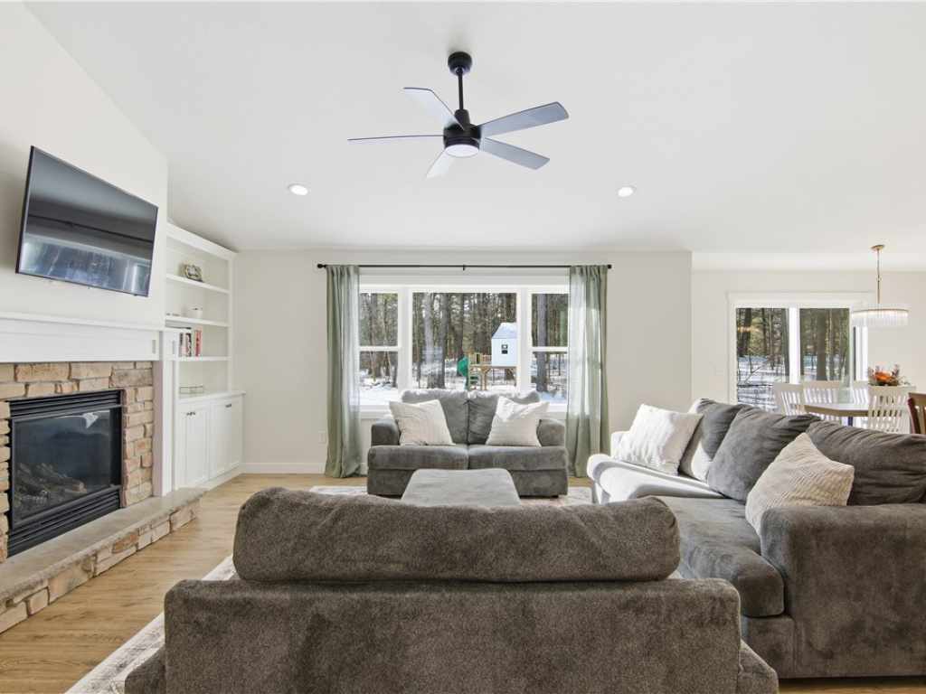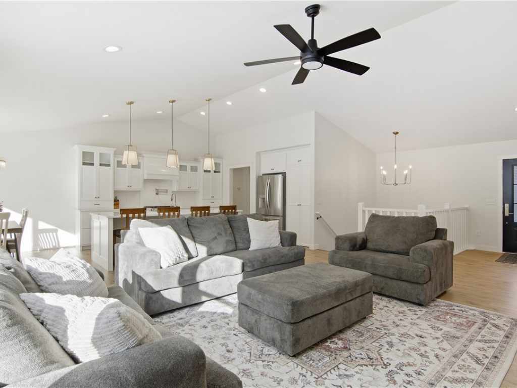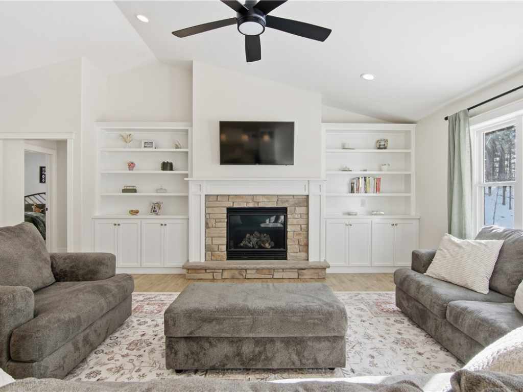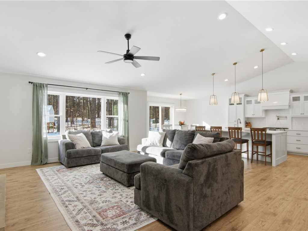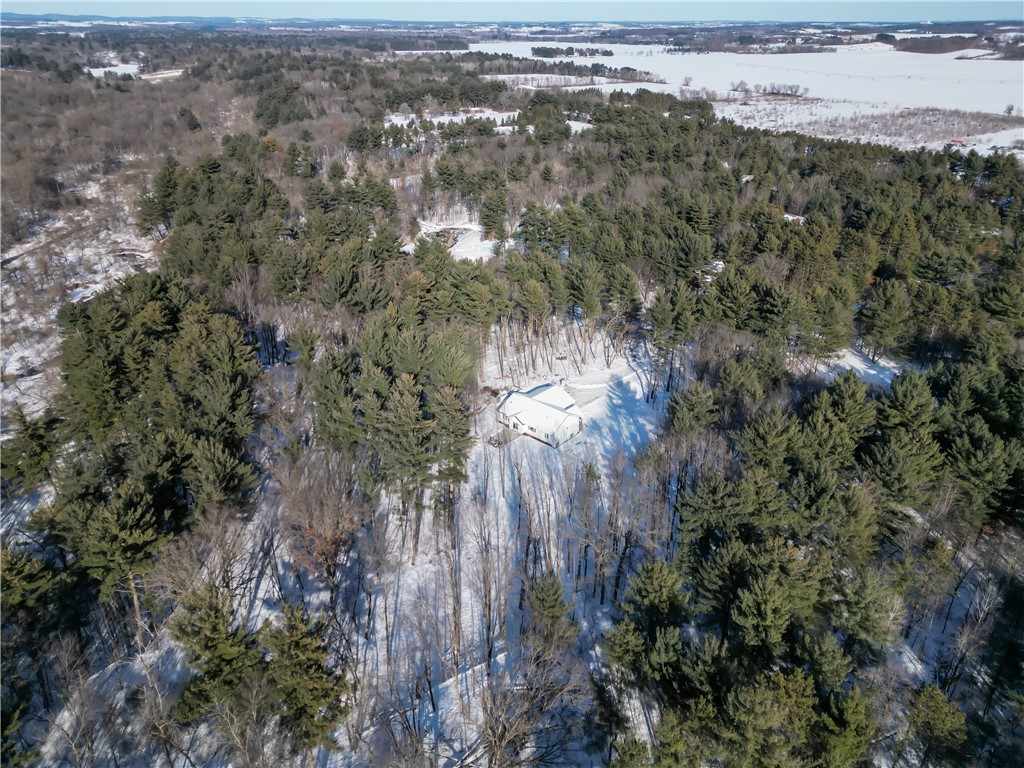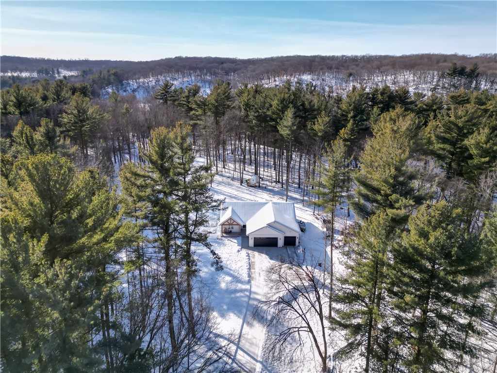 Beautiful home set back on 4.4 acres with access to Elk Creek, located just minutes outside of Eau Claire. Wooded lot with walking trails and an abundance of wildlife. Home features open concept living featuring fireplace with built cabinets and vaulted ceiling. Redwing Custom Cabinetry & flooring throughout. Custom kitchen with quartz countertops and spacious walk in pantry. Owner suite with walk in closet and tiled shower. Attached 3 car garage that is insulated with heater. Separate first floor laundry off mudroom with custom cubbies, cabinets and hanging racks. Lower level unfinished but set up for 2 bedrooms, family room and full bath. Fantastic home that is in like new condition.