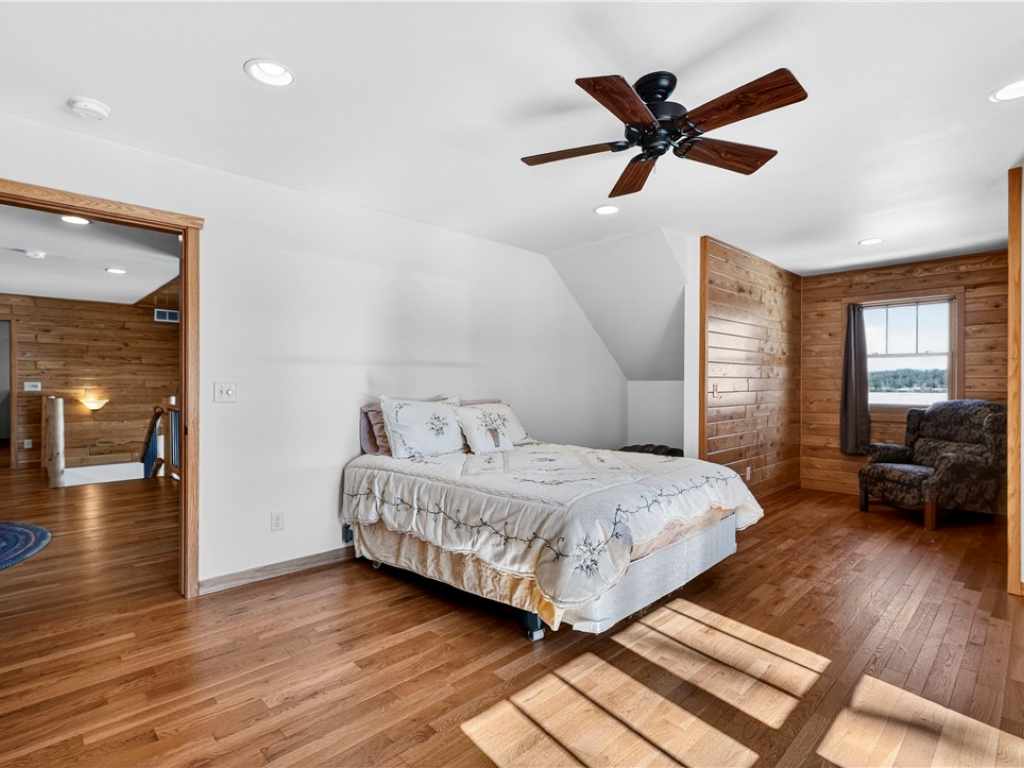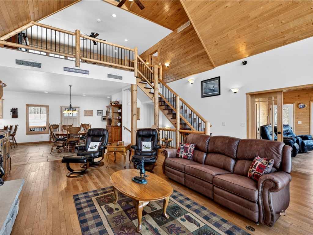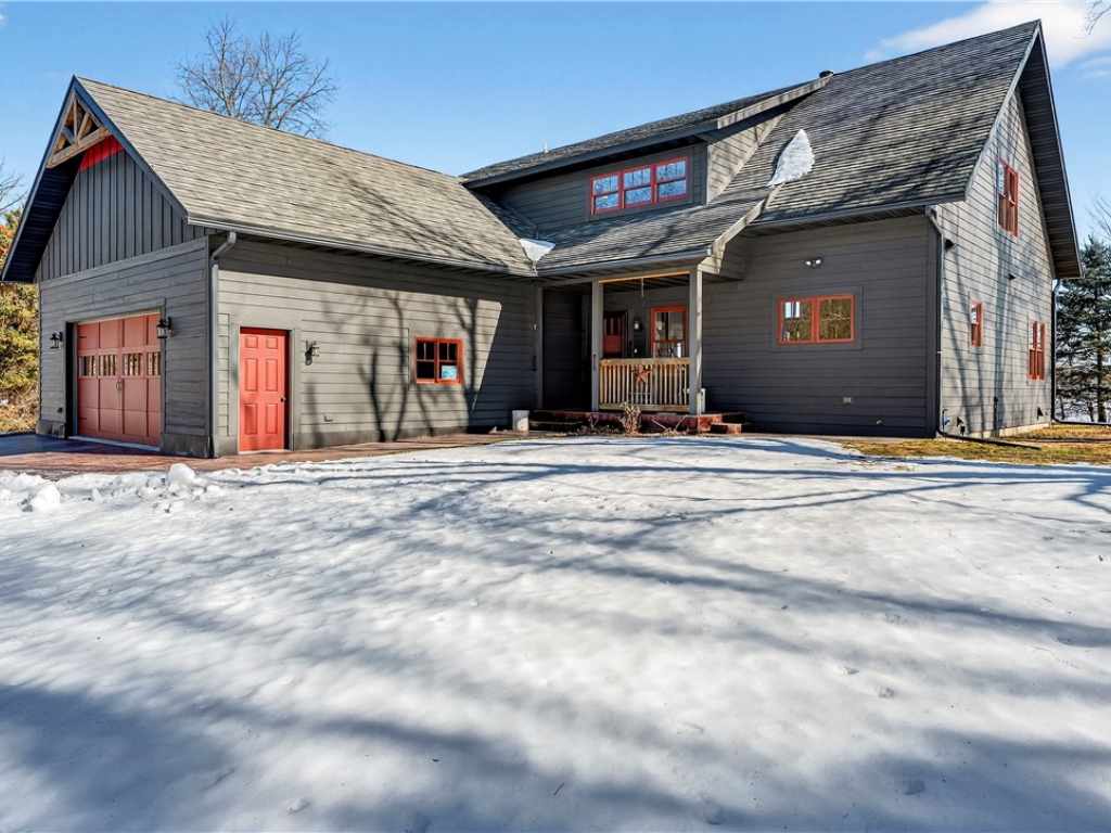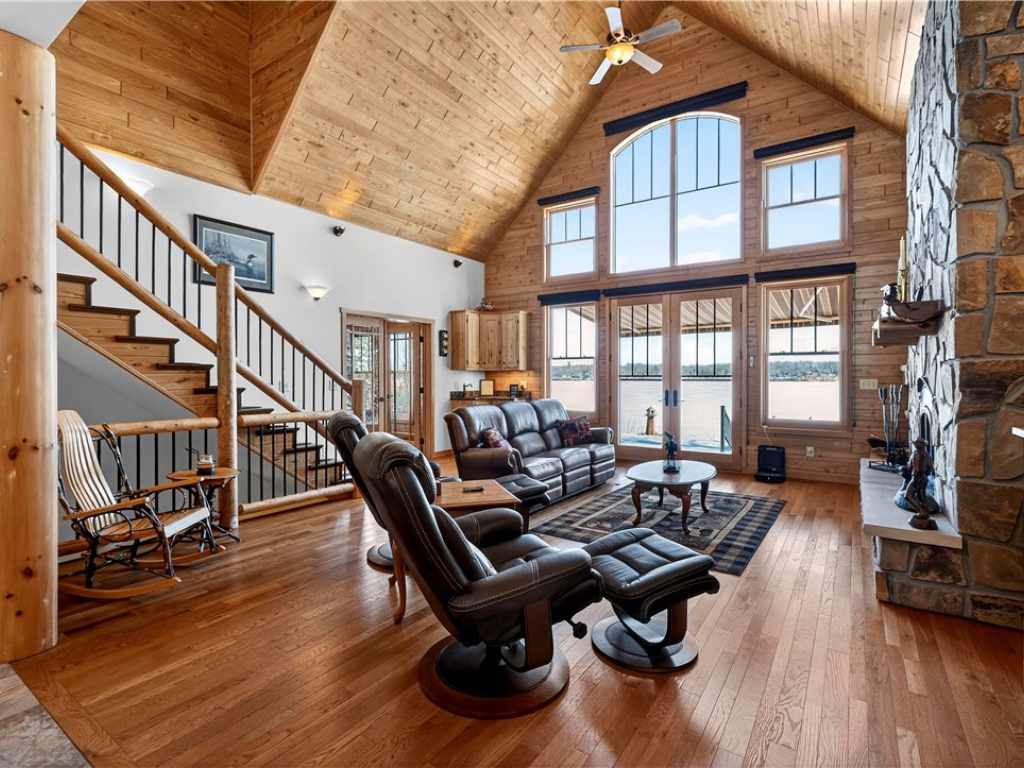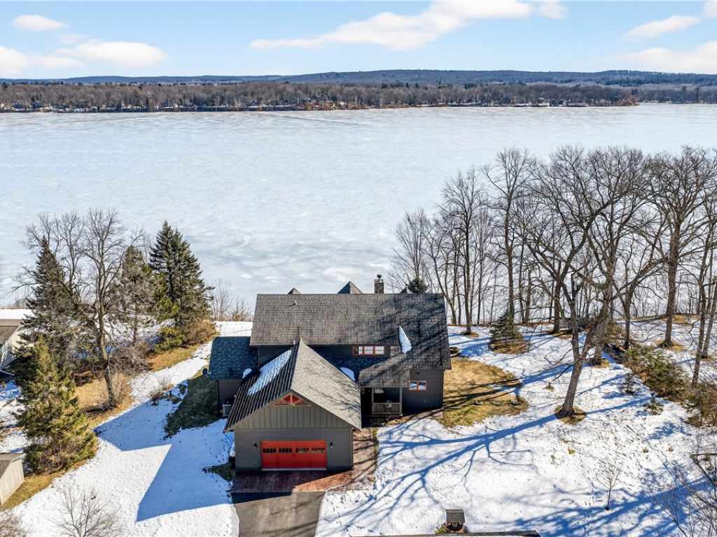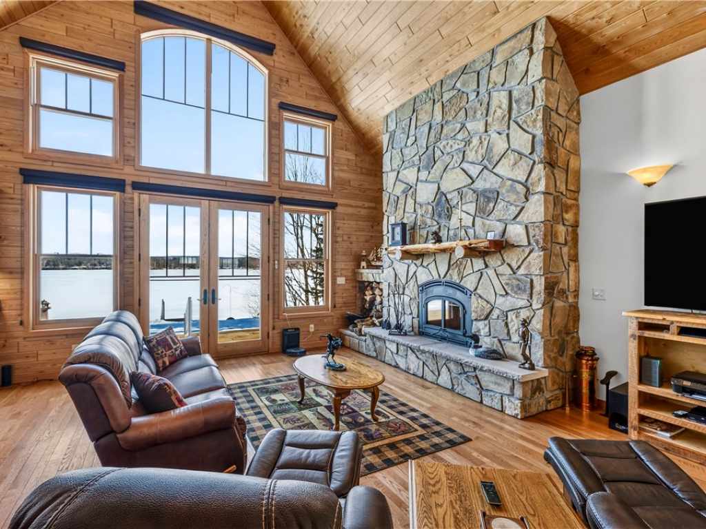 Amazing Chalet on the Red Cedar Lake Chain with 160 feet of pristine frontage! Built in 2016, this stunning 4,400 sq ft home showcases exceptional craftsmanship and high-end finishes throughout. The breathtaking great room features soaring ceilings, a majestic flagstone fireplace, and beautiful hardwood floors. The kitchen is a showpiece with custom rustic hickory cabinetry and Cambria quartz countertops, while a cozy loft captures stunning sunrise views over the lake. Comfort abounds with main level owner's suite and laundry, heated tile floors, in-floor heat, custom tile showers, a heated garage floor, and upgraded steel shingles for long-lasting durability. The lower level offers an incredible entertainment space plus the potential to finish two 13x31 rooms (804 additional sq ft) for a theater, extra sleeping quarters, or a fitness area. Outside, enjoy a large level lakeside yard, beautiful patios, stamped concrete walkways, and a retractable awning designed for effortless entertaining. A 20x40 heated detached garage provides excellent additional storage. The Red Cedar Chain offers 2,400+ acres of recreation, fishing, a boat-up golf course, a restaurant/pub with live music, and easy access to ATV and snowmobile trails.