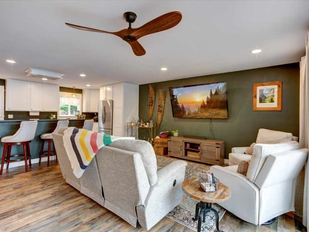 Welcome to your beautifully remodeled move-in ready lakefront home on Tainter Lake, offering .72 acres and 102 feet of prime water frontage with breathtaking sunset views. The home is designed to capture the beauty of the lake from nearly every angle. New triple patio doors in the living room and additional new patio doors off the master ensuite open to the expansive brand NEW 10x38 deck, creating effortless indoor-outdoor living and panoramic water views. Both levels have been fully updated with fresh drywall, new trim, and all new windows. The kitchen features granite countertops and stainless steel appliances, large center island and breakfast bar, blending modern style with everyday functionality.