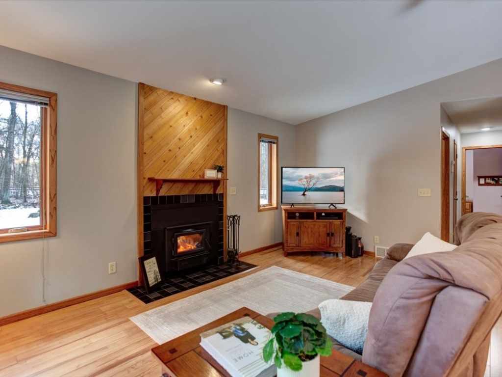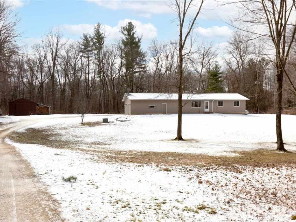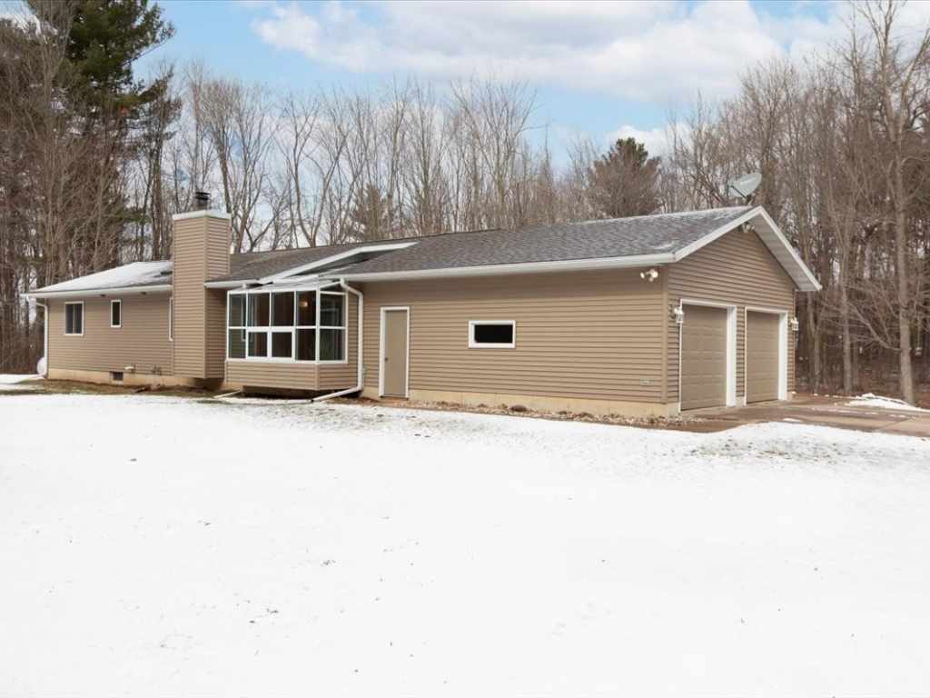 A Rare Find - Beautiful Country Home nestled in on 5 private acres!! All bedrooms and bathrooms are conveniently located on the main level. Nicely updated throughout, open-concept layout features vaulted ceilings, abundant natural light, spacious kitchen with stainless steel appliances and living room with woodburning fireplace. A gorgeous four-season sunroom with in-floor heat provides a perfect place to relax and enjoy views of the property. The master bedroom includes a private bath. The partially finished basement offers additional living space with a family room, exercise area, office or bonus room space, laundry room, and a very large storage room. Outside you’ll find a 2-car attached garage and a 27x20 storage shed with a concrete floor - ideal for equipment, hobbies, or extra storage. Great location - between Menomonie, Eau Claire and Chippewa with convenient access to nearby highways for commuters. This lovely home has been pre-inspected for peace of mind and includes a 14-month buyer home warranty!