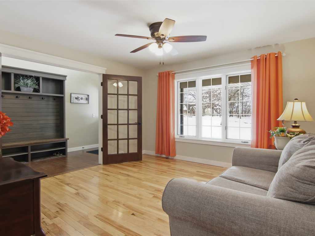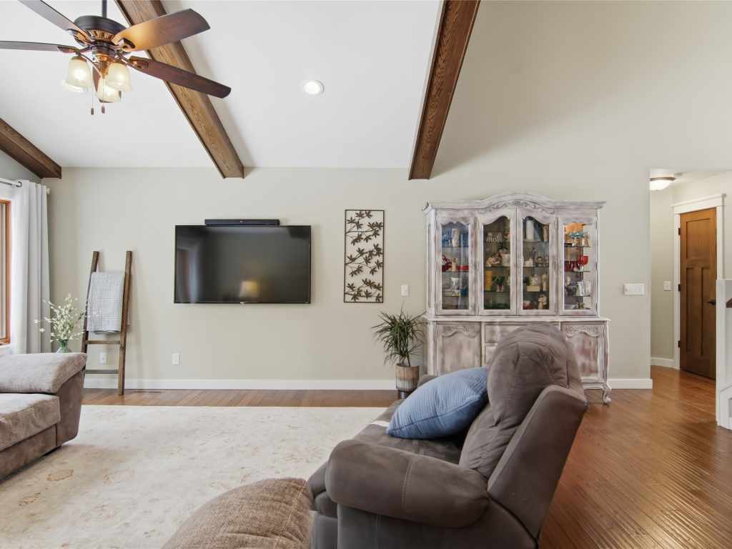 Exquisite Elk Mound retreat on 5 private acres! Step into this stunning 5 bedroom, 4 bath home where modern updates meet rustic charm. Vaulted ceilings with exposed beams greet you as you walk into the impressive entryway. The kitchen is a chef's dream...gutted and remodeled in 2018 with maple Aspect cabinetry, granite countertops, a 10 ft island & butler's pantry with laundry & coffee bar. Beautiful Oak Ebony hardwood floors flow throughout with an open concept feel that still has the ability to have quiet, separate rooms. The primary bedroom ensuite features double vanity, soaker tub & walk in closet & is situated in its own wing on the main floor with three additional bedrooms upstairs. Downstairs includes the 5th bedroom, large family room with fireplace, full bathroom and impressive hickory bar with quartz countertops. Whether you're hosting family gatherings or enjoying quiet country living, this home blends comfort, character, and modern convenience effortlessly.